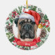 Este sofisticado Enfeites de natal cerâmico apresenta uma aquarela de um rosto Mastiff em um chapéu de Papai Noel, rodeado de verdinho, pinecones e bagas, com uma faixa vermelha com o nome do seu animal de estimação (ou a mudança para Feliz Natal). Você pode personalizar completamente esta design mudando a saudação e o ano atrás em uma fonte elegante. Este é um Enfeites de natal, ainda que barato, personalizado, e é perfeito para fãs Mastiff, amantes Bullmastiff, donos de Mastiff Ingleses, fãs de cães guardas, entusiastas de cães e amantes de animais de estimação.