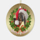 Linda pintura personalizada de Goat Doe Kid Nubiana, feita por goatLady do GetYerGoat™, toda decolada em seu Papai Noel, cercada por uma coroa de Natal verde de Holly em um fundo de ouro de um lado e o fundo de Silver Bokeh do outro lado - Personalize a Saudação que Diz Feliz Natal de um lado, personalize o nome do rebanho, o nome da fazenda ou da cabra (OU QUALQUER DING) assim como o ano do lado oposto - Enfeites de natal de Capa para a doação de presente de Férias, ornamentos de árvores de Natal ou janelas - designs duplos de lado e pode ser personalizado. Perfeito para trocas de ornamento em festas de Natal, presentes de Criador, presentes de veterinário, Mostrar presentes.