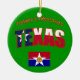 A frente deste Enfeites de natal é decorada com letras de rosto aberto soletrando "Texas" sobrepostas à bandeira do Texas, a bandeira de Dallas, e as palavras "Charistmas Felizes". O reverso é decorado com Papai Noel.