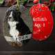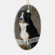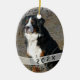 Um cão de montanha birmanês é o porta-fotos para este Enfeites de natal oval. A data do ano está em uma "fita" branca na parte inferior da frente, com texto na parte traseira para adicionar o nome do cão, a idade e qualquer outra informação.