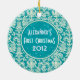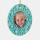 Os tons azuis-esverdeados e brancos elegantes remendos florais com fotos personalizadas de um lado e texto personalizável do outro lado. Enfeites de natal fotográfico. Disponível em outras combinações de cores e em outros produtos.