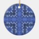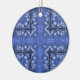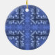 Um bonito padrão azul de velas e espirros decora este ornamento de férias cerâmico.