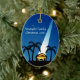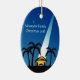 Enfeites de natal de Natividade Moderna Azul personalizado com seu nome ou manchete. Apresenta o céu azul e preto à noite com holofotes brilhando na cena da manga com o bebê Jesus, palmeiras e estrelas no céu. Ornamento religioso cristão excelente.