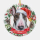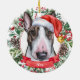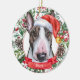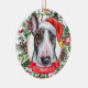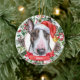 Esta sofisticada aquarela de um Enfeites de natal cerâmico de Cão Bull Terrier multi-colorido apresenta o terror de um chapéu de Santa, cercado por verde de férias, pinecones e bagas, com um banner vermelho com o nome do seu animal de estimação (ou troco para Feliz Natal). Você pode personalizar completamente esta design mudando a saudação e o ano atrás em uma fonte elegante. Este é um Enfeites de natal personalizado na moda é perfeito para fãs da Bull Terrier, proprietários terríveis, amantes da raça bully, amantes de cachorros e amantes de animais de estimação.