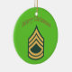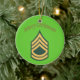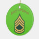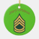Enfeites de natal de Primeira Classe do Sargento do Exército. Este ornamento é decorado de um lado com insígnias do Sargento do Exército de Primeira Classe e as palavras "Feliz Natal" e, do outro lado, com Papai Noel carregando um saco de doces.