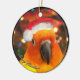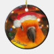 Ornamento bonito de Sun Conure! O papagaio veste um chapéu vermelho brilhante do papai noel na frente de um fundo colorido do inverno. Divertimento para a árvore do Xmas do amante do pássaro esta época natalícia.