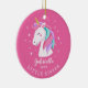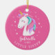 Personalize e Datas o Enfeites de natal de unicórnio fofo da irmã apresentando um unicórnio doce com um azul-turquesa, rosa e roxo e enquadrado com flores delicadas colocadas sobre um fundo rosa-escuro.
