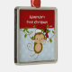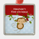 Os primeiros enfeites de natal do bebê caracterizam um macaco adorável do papai noel que veste um chapéu do papai noel que balança em um grupo da selva azul & branca fundo pontilhado em uma polca! Disponível em uma forma do coração em nossa loja! Personalize com sua informação do bebê e data e você são todos ajustam-se para ir! Presente datado maravilhoso da lembrança para Natal do seu bebê o ø.