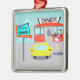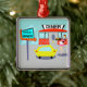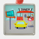 Servir acima algo especial com estes enfeites de natal do comensal dos anos 50. As características de design do desenho dos desenhos animados uma construção de tijolo vermelho com janelas azuis, as portas dobro cinzentas, e um sinal branco que dissesse, "comensal" empoleiraram-se no telhado. No parque de estacionamento, um segundo sinal está em um pólo. O sinal tem um fundo de turquesa e uma seta vermelha de piscamento que apontam a maneira a, de "o comensal Don." O sinal fez seu trabalho porque há um carro amarelo brilhante com as aletas estacionadas ao lado dele. Mesmo que nós não possamos os ver, os passageiros do carro devem smacking seus lábios. Um carhop bonito, novo é rollerskating sua maneira ao carro. Seu cabelo triguenho está em um rabo de cavalo bouncy. Está vestindo um uniforme curto, cor-de-rosa com guarnição preta e um avental branco. Equilibrado em uma mão, o carhop está levando uma bandeja preta que guardara um Hamburger gigante e um refrescamento, garrafa antiquado, de vidro da soda. O fundo atrás do comensal é cerceta com luz - nuvens azuis e as silhuetas de árvores de cedro.