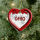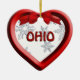Um design gráfico de flocos de neve em um quadro vermelho estilo 3D em um Enfeites de natal Ohio com forma cardíaca. O ornamento tem modelos de texto para sua personalização. ©2012charmanepaulson