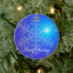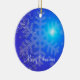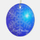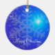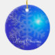 Enfeites de natal exteriores com imagem de flocos de neve em fundo azul e texto personalizável.