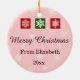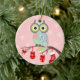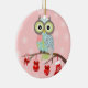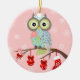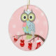 A coruja nas máscaras da cerceta e do seu corpo tem um cor-de-rosa aumentou com folhas do verde limão e teste padrão circular branco na cerceta clara. As asas estão em castanho chocolate com teste padrão branco. Os ornamento são 2 bolas vermelhas, bastão de doces, e uma peúga vermelha no ramo. O fundo é flocos de neve no rosa. A parte traseira do ornamento é flocos de neve no rosa e os textos estão em castanho chocolate e são customizáveis. Esta é uma ilustração digital.