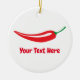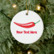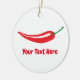 Enfeites de natal feitos sob encomenda com logotipo vermelho da pimenta. Lembrança bonito do feriado de inverno para o ícone quente da comida. Faça sua própria decoração da decoração e da árvore do xmas. Inclui a corda do brilho do ouro para pendurá-la acima. Adicione sua própria foto na parte traseira opcionalmente. Cor customizável do fundo e nome personalizable. Ideia do presente do divertimento para o cozinheiro do cozinheiro chefe, o vegetariano etc.