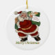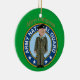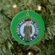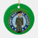 Enfeites de natal Nacional de Soldados de Guarda. Esta Enfeites de natal é decorada na frente com o logotipo da Guarda Nacional, um Soldado de brinquedo vestindo a peça da Guarda Nacional em sua bereta, e as palavras "Feliz Natal". As costas estão decoradas com Papai Noel e seu saco de doces. Uma ideia de presente de excelente.