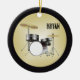 O conjunto de tambores personalizou o ornamento da árvore de Natal com modelos para nome na frente e mais texto personalizado na parte traseira. Borda negra e fundo de ouro leve. Tambores e cimbais fotografados neste conjunto de cinco peças com trono. Enfeite cerâmico redondo com corda de ouro para pendurar. ...............