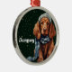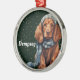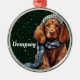 Um adorno de feriado divertido apresenta um filhote de Setter irlandês com boné de inverno e cachecol. Adicione um toque personalizado com o nome do cão ou outra mensagem especial. Excelente de presente para amantes de cães!