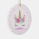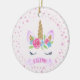 Cercado por corações cor-de-água rosa, este enfeites de natal de unicórnio rosa e dourado fará um belo presente personalizado para qualquer amante de unicórnio.