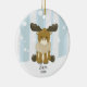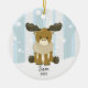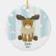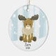 Enfeites de natal de alce giro cercado por árvores de inverno e fundo de neve. Personalizar com nome e ano.