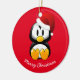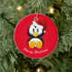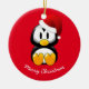 Enfeites de natal mostrado em forma redonda com fundo vermelho e um impressão de pinguim de feriado bonito. Personalize este item ou comprar como está.