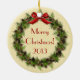 Bonita boneca de cachorrinho vermelha em coroa ao redor do adorno de Natal Feliz. Este adorável ornamento cerâmico de arte dupla de festas apresenta um preguiçoso vermelho no centro de uma coroa de festas com pínus cones e bagas! As costas também têm uma bela coroa e arco com as palavras "Feliz Natal" e o ano! Uma maravilhosa adição à sua coleção de ornamentos, decoração de feriados e um presente de excelente para a família, amigos e alguém que ama o pirata!