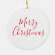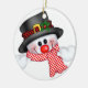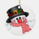 Este Enfeites de natal cerâmico é mostrado aqui com um impressão de boneco de neve de férias. No verso diz Feliz Natal em vermelho. Personalize este item ou comprar como está. Imagem do stock