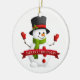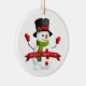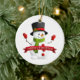 Enfeites de natal apresentado em forma redonda, feito de porcelana com cor branca de fundo e design de boneco de neve festivo. Personalize este item ou comprar como está.
