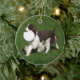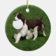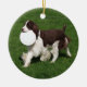 Este é um Enfeites de natal cerâmico redondo, com uma fotografia original de um espanhol de Springer, branco, fígado e fígado, correndo com uma abelha, com fundo verde de grama.