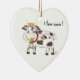 Um Enfeites de natal cerâmico divertido em forma de coração, com a ilustração de uma vaca branca e negra suíça vestindo um sino de vaca suíço ao redor do seu pescoço e mastigando uma flor amarela silvestre. Também tem as palavras "Eu amo vacas!" no lado superior direito :) © ArianeC Ilustrações