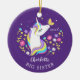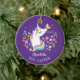 Personalize e Dated Cute unicorn Enfeites de natal com um unicórnio arco-íris com uma borboleta emoldurada com flores colocadas sobre um fundo roxo escuro.