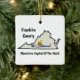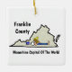 Este ornamento celebra o fato de que Franklin County, Virginia é o Capitólio Moonshine do Mundo. A design mostra o lugar onde Franklin County está no Estado de Virgínia (centro inferior) e a Hillbilly está se inclinando contra ela. Há um jarro de lua à esquerda do condado. O texto posterior pode ser o que você quiser (ou removido). Faz um presente divertido para alguém ou como um ornamento para sua própria árvore. Desenhado por Sheila Cicchi, Brownielocks.com. Todos os Direitos Reservados. NOTA: O Dia da Lua é sempre 5 de junho.