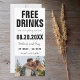 A tipografia negra e branca divertida "Bebidas grátis (e vamos nos casar), salve as datas. Personalize com seus nomes, local do casamento, data do casamento e foto favorita.