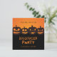 Um convite unilateral. A frente mostra quatro abóboras entalhadas em uma fileira e "Festa de Halloween" na fonte verde abaixo. O texto do convite e da data são personalizáveis. O fundo é laranja e os outros elementos são negros. A parte de trás mostra as abóboras e o texto personalizável com o endereço e as informações de contato. Engraçado, legal e assustador. Um produto em uma suíte de festas.