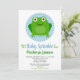 Este convite para o bebê borrifador apresenta um sapo verde engraçado com grandes olhos num fundo espiral azul.