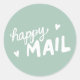 Uma etiqueta de embalagem que diz "correio feliz" em branco, em fundo amarelo. Isto seria perfeito para quem procura rótulos de embalagem fofos ou selos de envelopes para uma pequena empresa ou para decorar encomendas e pacotes para enviar aos amigos.