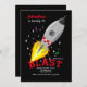 Um foguete ao estilo da década de 1950 a explodir no espaço com estrelas, um planeta e um disco voador contra fundo escuro. A palavra "Blast" pode ser arrastada para qualquer local, maior ou menor (+-). Perfeito para sua festa espacial!