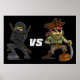 Poster preto com um rosto entre piratas e ninjas. Há um ninja preto de desenho animado que tem duas katanas marrons em bainhas, cruzando os braços e se posicionando sobre uma rocha. Há também um pirata de desenho animado que tem uma cinza, um pedaço de olho, uma perna de pino, um gancho, uma tatuagem que diz a mãe, um chapéu marrom, uma bota, uma camisa verde para cima, calças caquis, um vermelho com bandana branca, um cinto de ouro, e brincos de pé em um baú do tesouro.