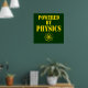 Acionado pela Física - letras amarelas do stencil e gráfico atômico com fundo verde-escuro.