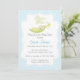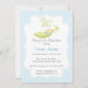 Convite do chá do bebé com ervilha em um design do vagem e em uma luz - fundo azul do polkadot.