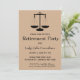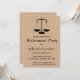 Este cartão de convite editável apresenta as escalas da justiça contra um fundo marrom. Abaixo estão os detalhes editáveis do evento. Este cartão é mostrado para a aposentadoria de um juiz, mas também pode ser usado por qualquer motivo para celebrar (formatura, novo emprego, promoção, aposentadoria) para qualquer profissão jurídica.
