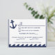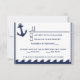 Seleção de menu do rsvp azul e branco marinho náutico 2 - o design é composto por uma âncora, corda e ondas do oceano inferior. Os designs, o texto e os contornos estão em marinho azul com um fundo branco. No verso há uma âncora maior e uma borda branca sobre um fundo azul marinho. Por padrão, o papel é definido como estoque básico de convites, mas pode ser alterado clicando em 'escolher seu estilo' e usando a caixa suspensa Papel, selecione uma das opções. Cada convite vem com um envelope branco. Para alterar a fonte, o tamanho da fonte ou a cor da fonte, clique no botão personalizar abaixo do rsvp do casamento náutico. Observe que você pode ter que personalizá-lo se determinadas palavras forem muito longas e, portanto, ele ajustado melhor. Se estiver satisfeito com a configuração da fonte, você poderá usar o recurso personalizar para alterar as informações da demonstração para seus detalhes pessoais. Clicando nas pequenas imagens da frente/traseira da placa com mudança para aquele lado para que ela possa ser alterada. Quando terminar, verifique se as informações aplicadas estão corretas e se você não tem erros ortográficos em ambos os lados da placa. Outros produtos que acompanham este.