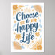 Brilhe seu espaço com esta animada impressão de arte "Escolha uma vida feliz". O vibrante design de aquarela apresenta uma citação escrita à mão rodeada por florais lúdicos e filmes de sol, positividade radiante e otimismo. Perfeito por adicionar uma explosão de sol à sua sala de estar, quarto ou escritório.