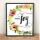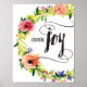 Design de tipografia com uma bela caligrafia elegante com palavras, "Escolha a Alegria." A tipografia é enquadrada por uma coroa floral de cor aquosa em fundo (formando um semicírculo à esquerda de design).