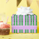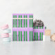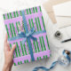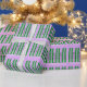 Escos verdes na neve com papel de embrulho de Natal de fundo roxo.