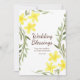 Cartão de convite de bênçãos de casamento com uma escritura do livro de Bíblia de John 15:12 e decorado com flores amarelas brilhantes entre as formas de verde pintadas com aquarela. Ao contrário, há um tom muito leve de amarelo e texto que você pode editar para ajustado de suas necessidades.