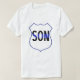 Esta camisa apresenta um escudo azul ao redor da palavra "Filho" que tem uma fina linha azul através dela para que o mundo saiba que você apoia seu pai.