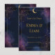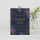 Escuro Celestial Salvar a Data | Douradas constelações, anúncio de casamento entre estrelas e lua Anuncie seu dia especial com esta noite celestial, salve a data, projetada com nuvens sonhadoras de aquarelas em matizes marinhos e roxas, constelações de ouros, estrelas cintilantes e uma lua crescente brilhante. Uma borda de ouro refinada adiciona um acabamento elegante, perfeito para boho, cósmico ou casamentos noturnos. Este modelo totalmente personalizável permite personalizar facilmente seus nomes, data e local do casamento.