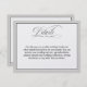 Um cartão elegante a ser usado como cartaz com seus convites de casamento para fornecer aos seus convidados detalhes sobre seu casamento ou outra ocasião especial. Edite o texto de exemplo com todos os detalhes que deseja compartilhar com seus convidados. A cor de fundo da cinza prateada que rodeia este cartão pode ser alterada para qualquer outra cor para corresponder às cores do seu casamento. Para alterar a cor da borda, escolha "personalizar mais" e selecione a cor desejada no selecionador de cores de fundo.