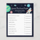 Cartão de jogo "o preço está certo" com o tema do espaço em branco, com ilustrações de planetas, astronautas, estrelas. Os textos são editáveis. Um jogo perfeito para jogar durante o chá. Enumera o essencial do bebê e aos hóspedes para adivinhar o preço. Quem quer que adivinhe o preço mais próximo ganha!
