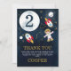 Meninos Espaço Ameaçado de Aniversário Este cartões de agradecimentos de aniversário de menino do templo espaço bonito apresenta uma grande lua naves de foguete, astronauta, planetas e estrelas e constelações de brilho dourado. Esta design é uma forma fofa de obrigado para os convidados por terem vindo à festa de aniversário espacial da vossa pequena.