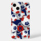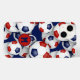 Esta capas de iphone de tema de futebol apresenta bolas de futebol vermelho, azul e branco de tamanho variado organizadas em um padrão aleatório em um fundo azul personalizável — personalize seu monograma, letra de diversidade ou número de camisa — por katz_d_zynes